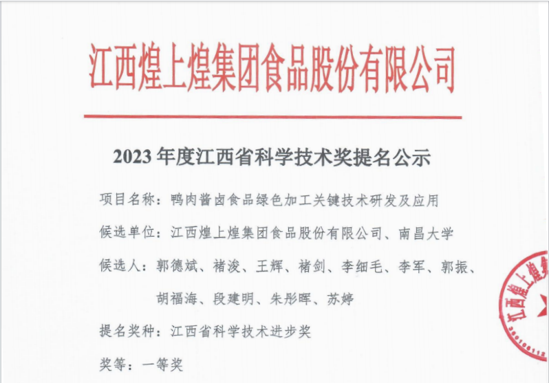 關(guān)于江西煌上煌集團(tuán)食品股份有限公司申報(bào)2023年度江西省科學(xué)技術(shù)獎(jiǎng)提名公示依據(jù)《關(guān)于2023年度江西省科學(xué)技術(shù)獎(jiǎng)提名工作的通知》(贛科發(fā)成...