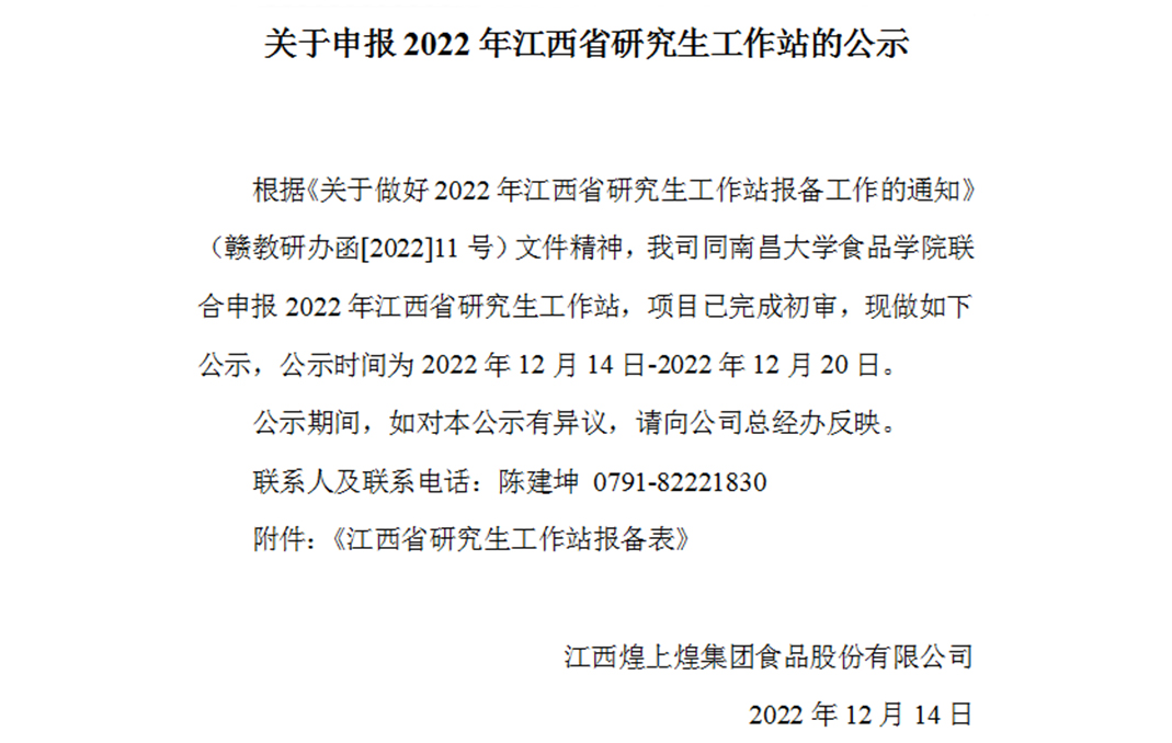 根據(jù)《關(guān)于做好2022年江西省研究生工作站報(bào)備工作的通知》(贛教研辦函[2022]11號(hào))文件精神,我司同南昌大學(xué)食品學(xué)院聯(lián)合申報(bào)2022年江西省...