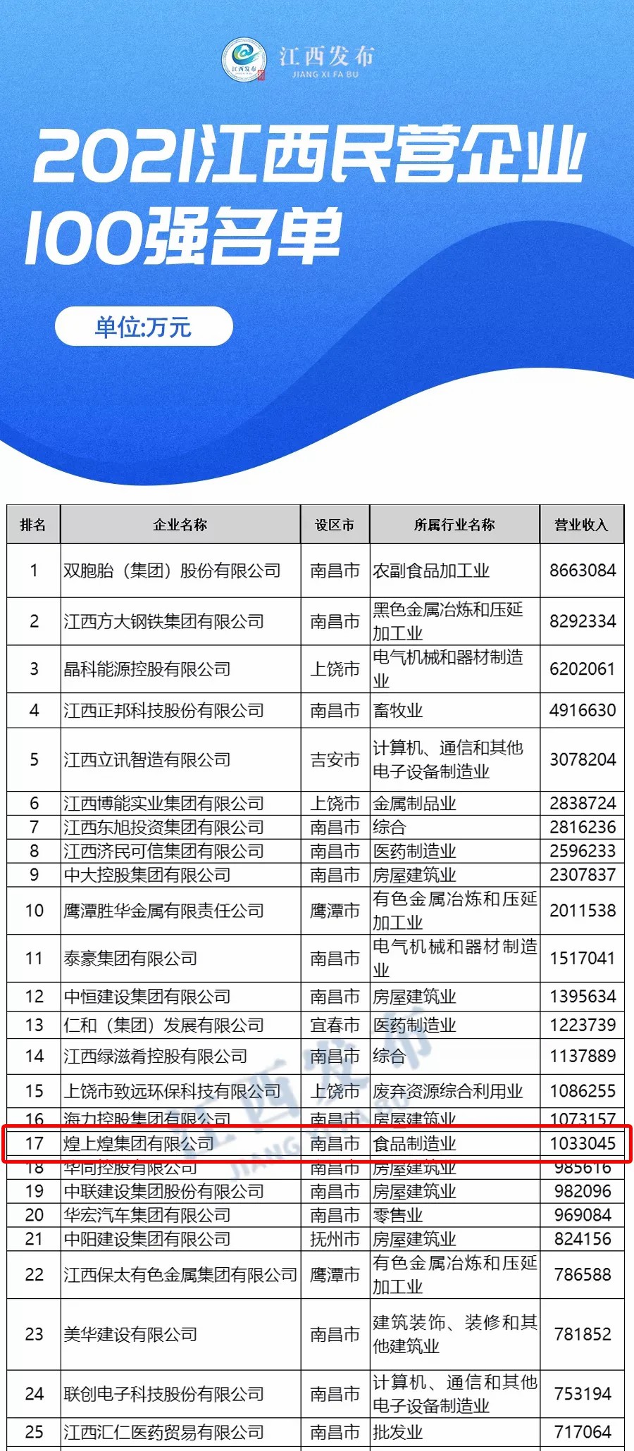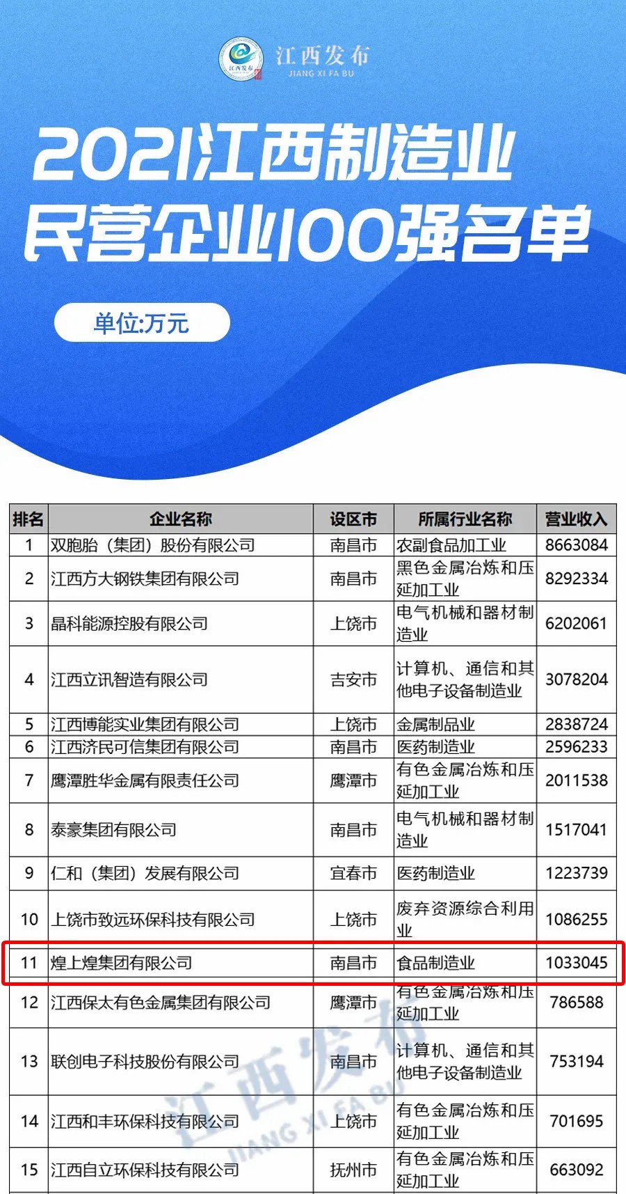 喜訊 | 煌上煌集團斬獲2021“江西民營企業(yè)100強”“江西制造業(yè)民營企業(yè)100強”