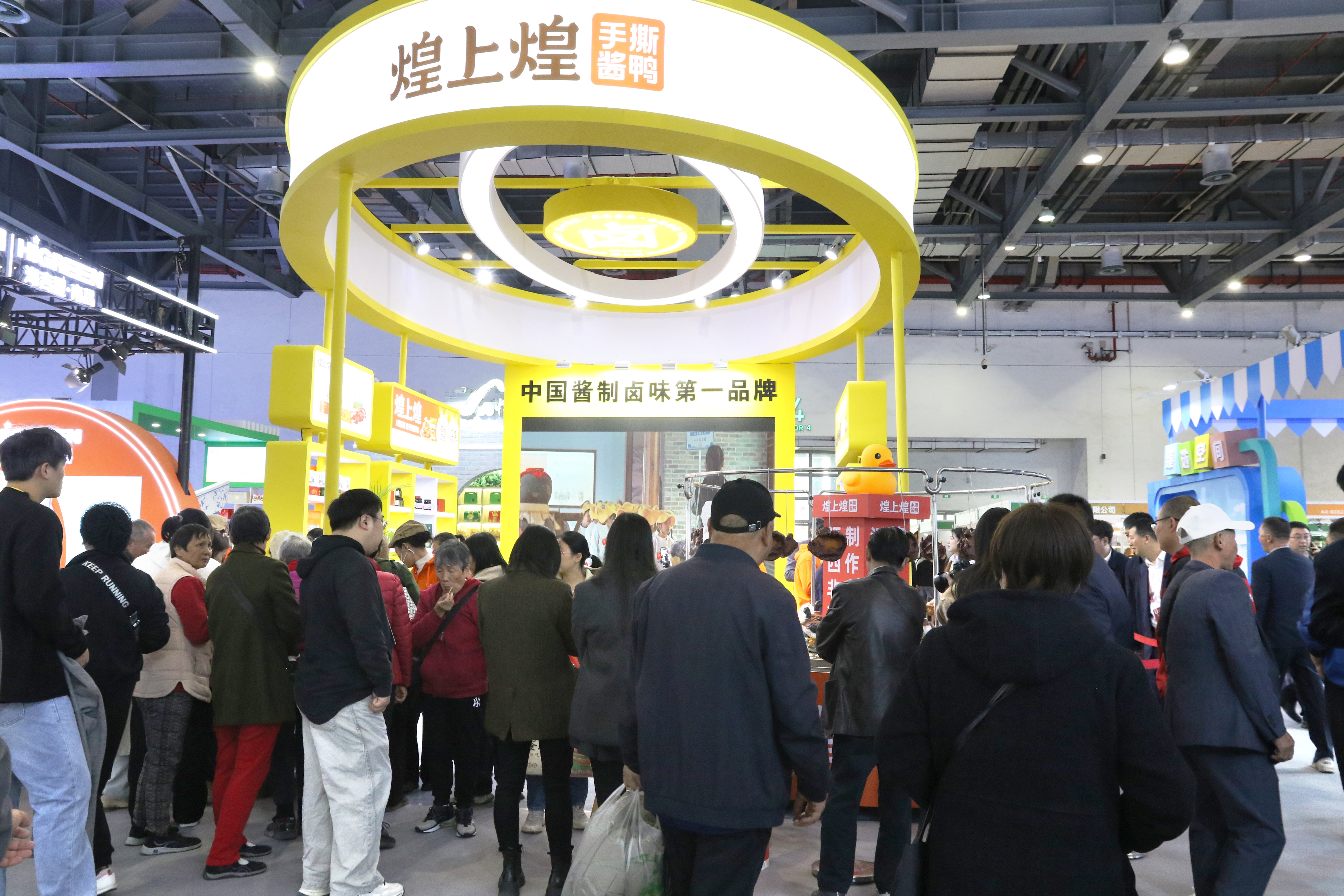 會(huì)上,煌上煌搭建起品牌專屬展區(qū),被列為“江西美食名片”的手撕醬鴨、樂鮮裝鮮貨系列、包裝產(chǎn)品、真真老老禮盒、新西蘭新溪島蜂蜜等等,品類豐富、琳瑯滿目,強(qiáng)勢展出了煌上煌品牌的多樣性,。直徑2.8米的大鹵鍋架設(shè)在展廳,鍋內(nèi)三十余味香料與陳年老鹵翻滾交融,現(xiàn)鹵的醬鴨泛著琥珀色光澤,空氣中彌漫著濃郁的醬香,讓人垂涎欲滴。醬鹵師傅現(xiàn)撕、現(xiàn)拌,現(xiàn)場免費(fèi)品嘗手撕醬鴨,吸引了眾多展商上前品嘗,大家贊不絕口。同時(shí),展區(qū)也招攬了許多意向合作商前來洽談與合作。